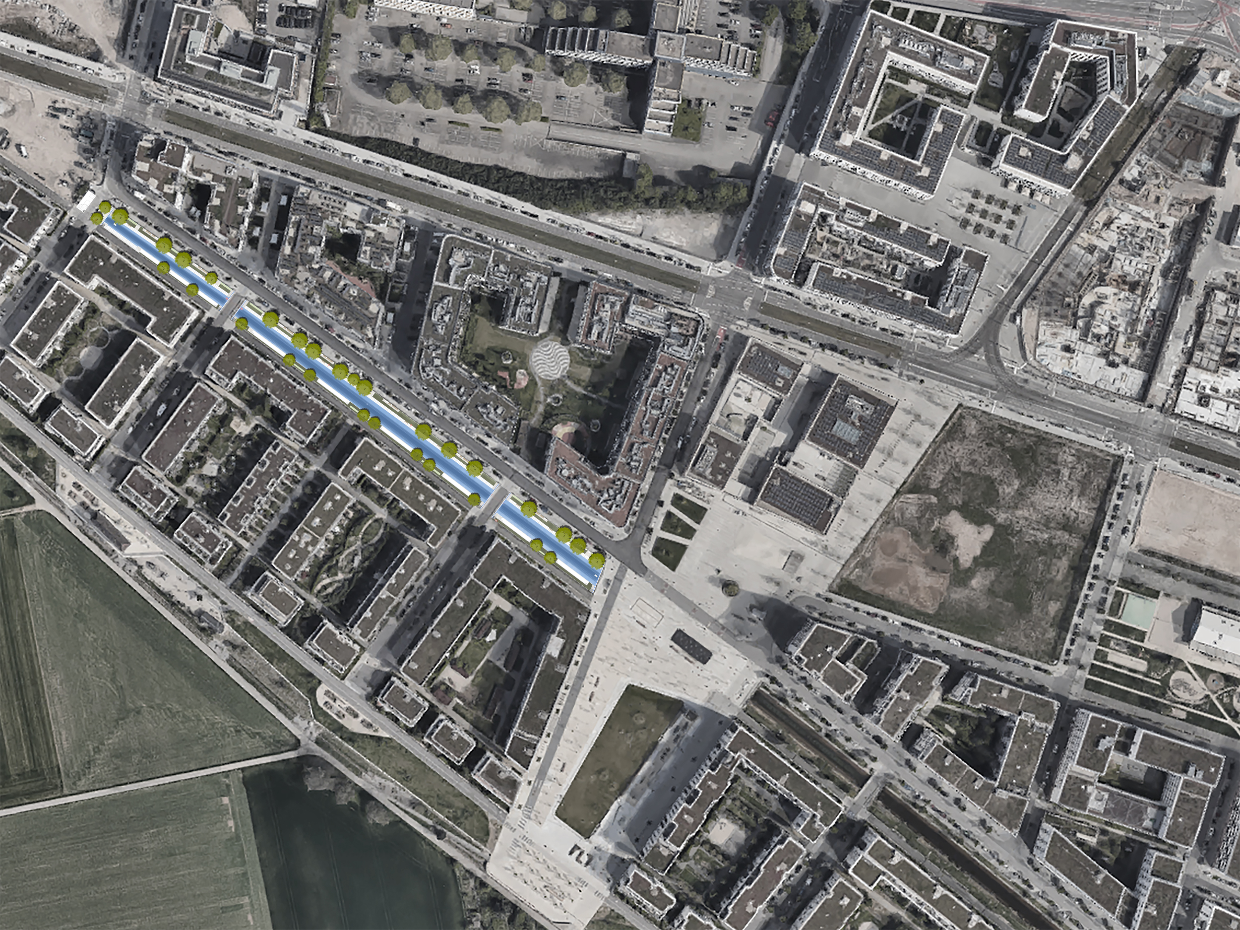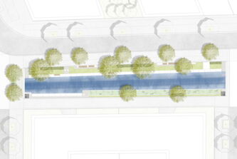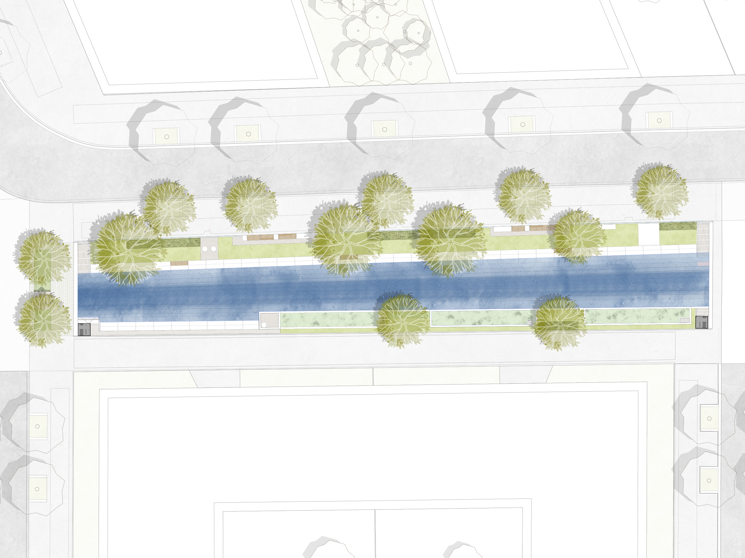 Die Teichanlage verläuft zwischen dem südlichen Wohnweg und der Verkehrsstraße Langer Anger. Sie übernimmt die Funktion der Regenwasseraufbereitung und Regenwasserspeicherung der begleitenden Baufelder inkl. deren Dachflächen. Begleitet wird die Teichanlage beidseitig mit einem grünen Uferstreifen, welcher mit Sitzmobiliar und Freitreppen, sowie ergänzenden Baumpflanzungen ausgestattet wird. Somit kann neben der Verortung der Technischen Bauwerke innerhalb der Uferzonen ebenso die Aufentaltsqualität sichergestellt werden.