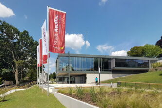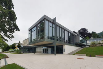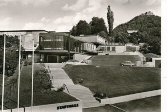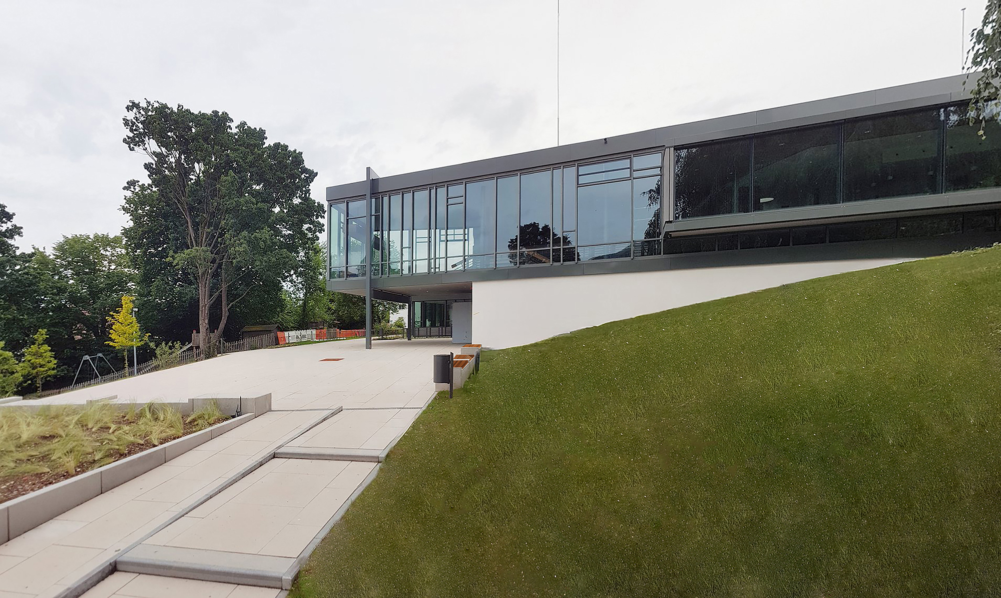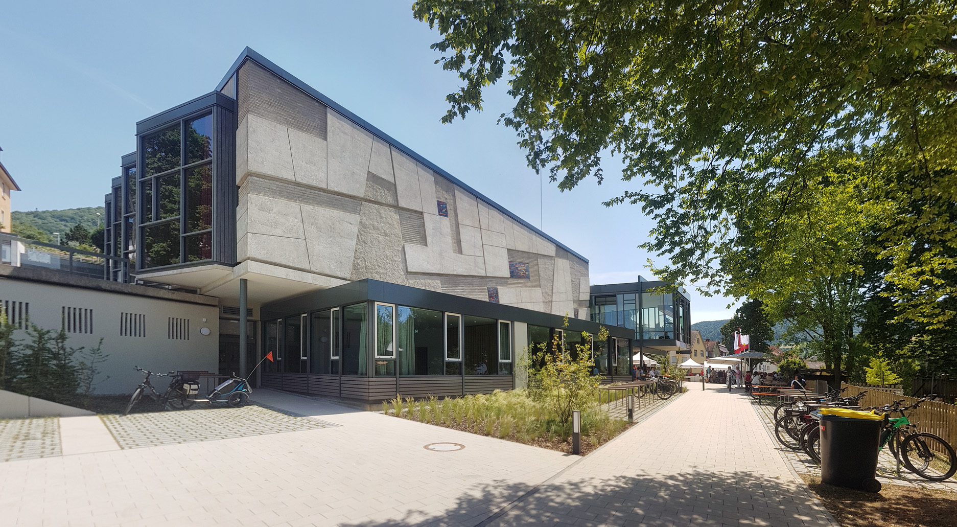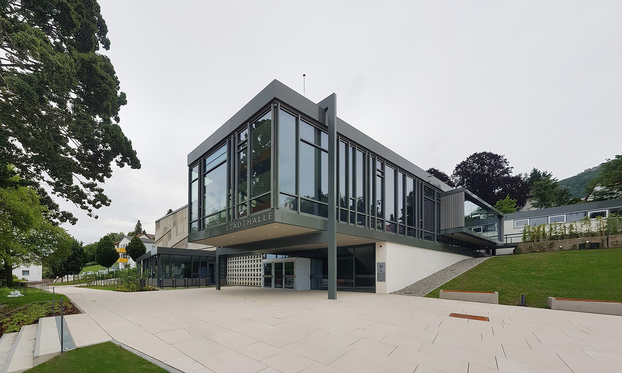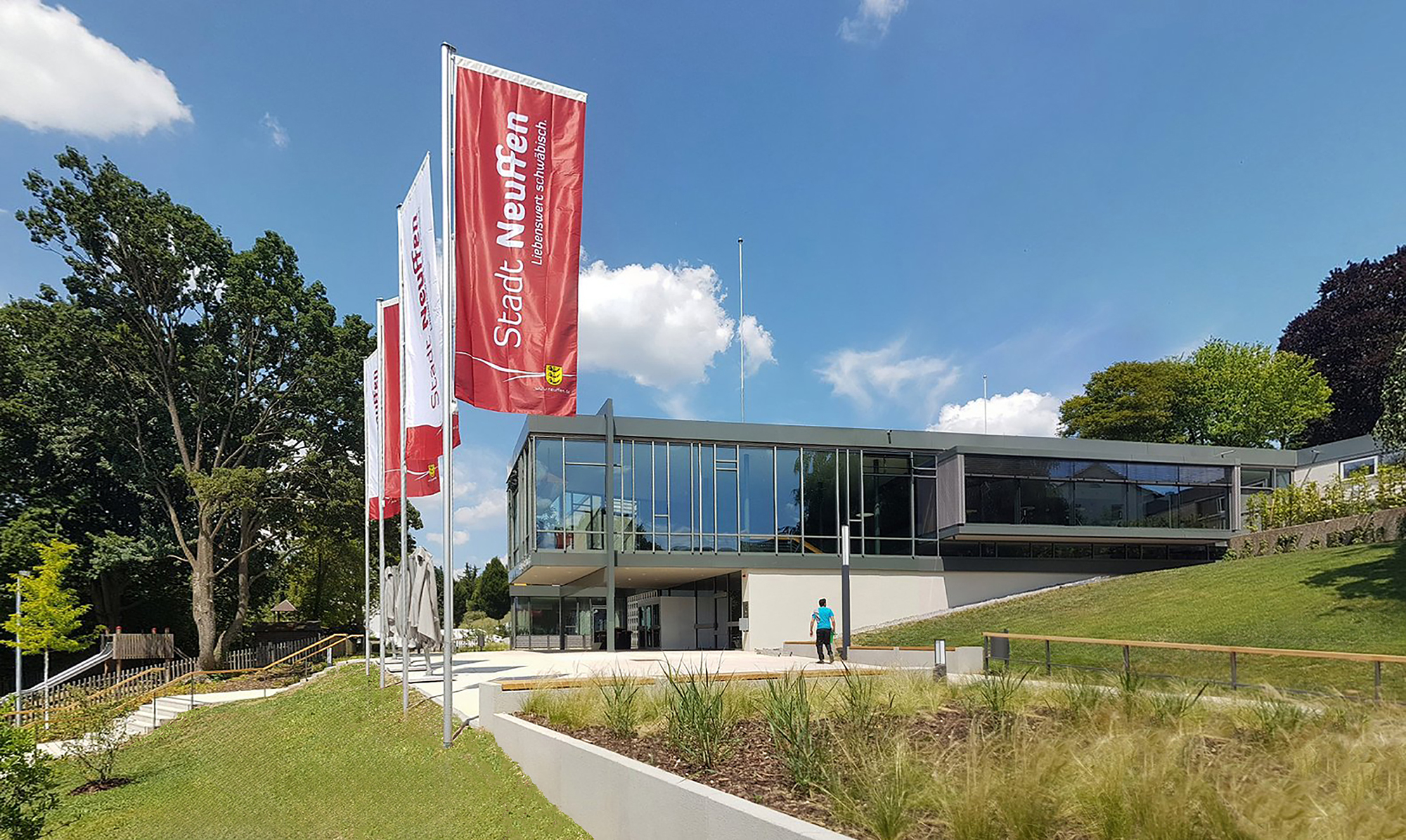 Mit der Sanierung der Stadthalle in Neuffen wurde auch das Umfeld neugestaltet und aufgewertet. Ziel der Maßnahmen ist die optimale Integration der in Hanglage sich befindenden Gebäudeteile in den Bestand und den umgebenden Stadtraum. Der Zugang ist nun komplett barrierefrei möglich. Über die große Freitreppe kommend, öffnet sich der Vorplatz am Haupteingang und bietet neben den Stellplätzen für Fahrräder auch Sitzbänke zum Verweilen. Auf der Zwischenebene (ehem. Restaurant) befindet sich die Aussenterrasse mit Ausblick über die Stadt.