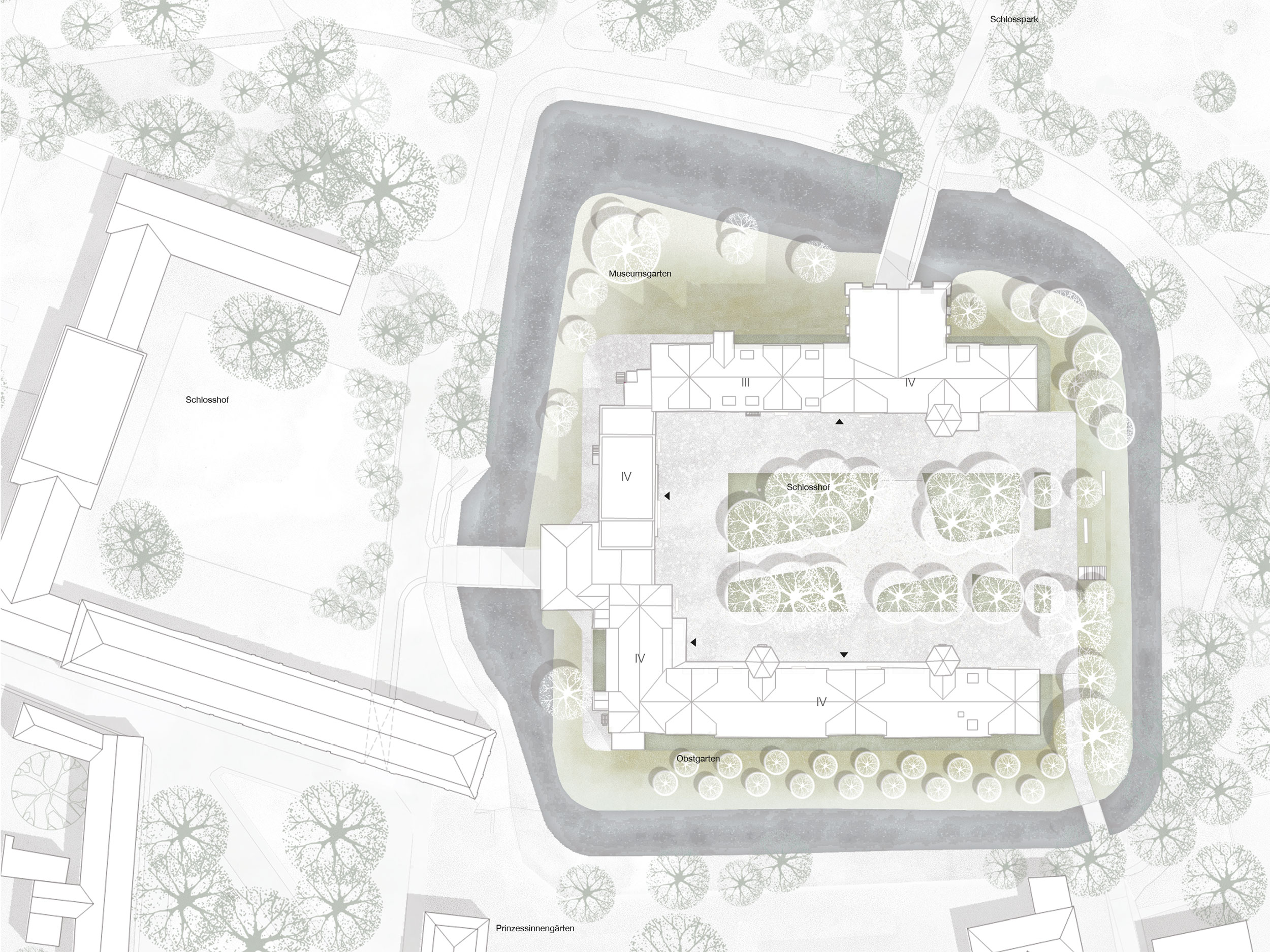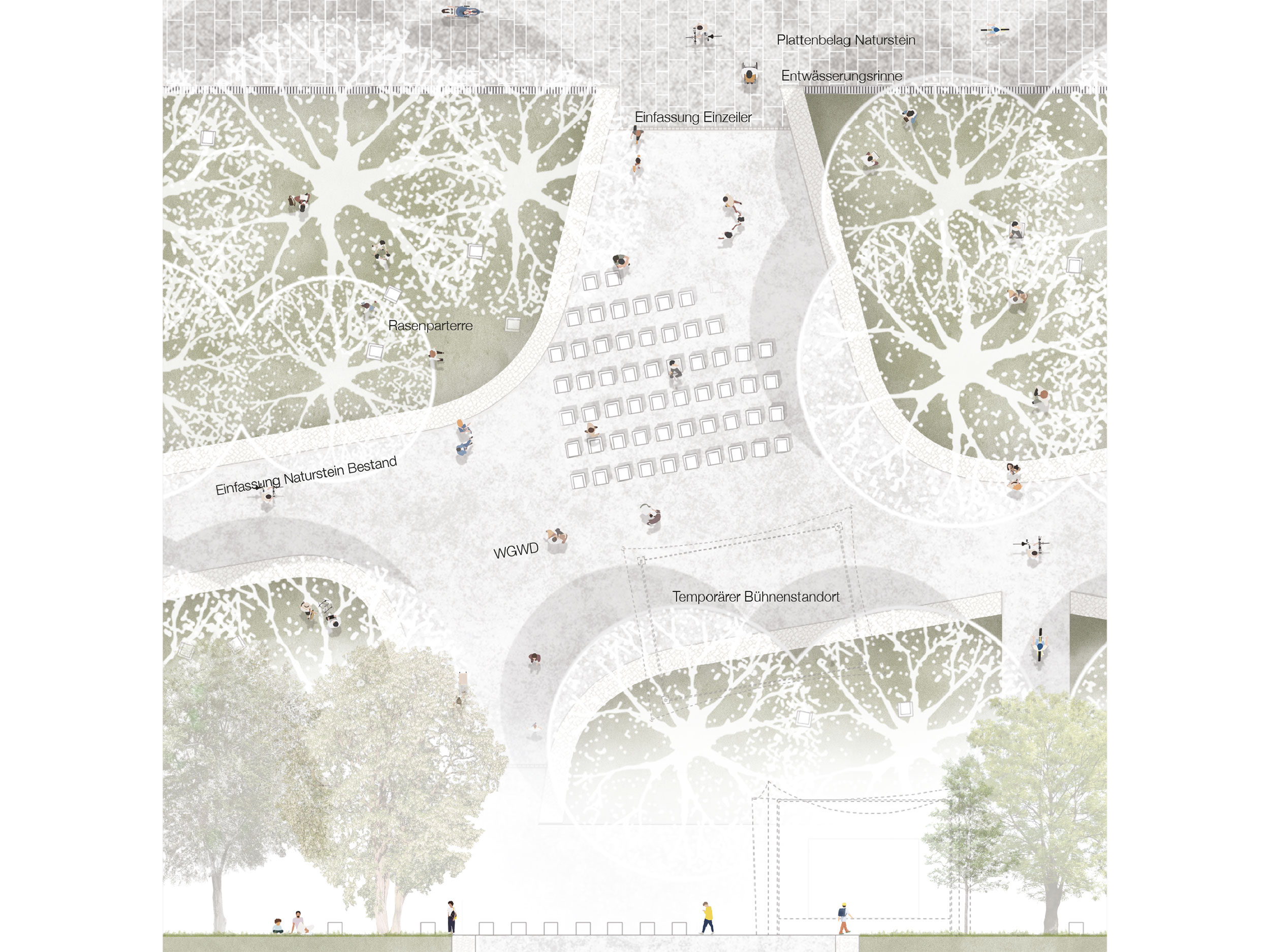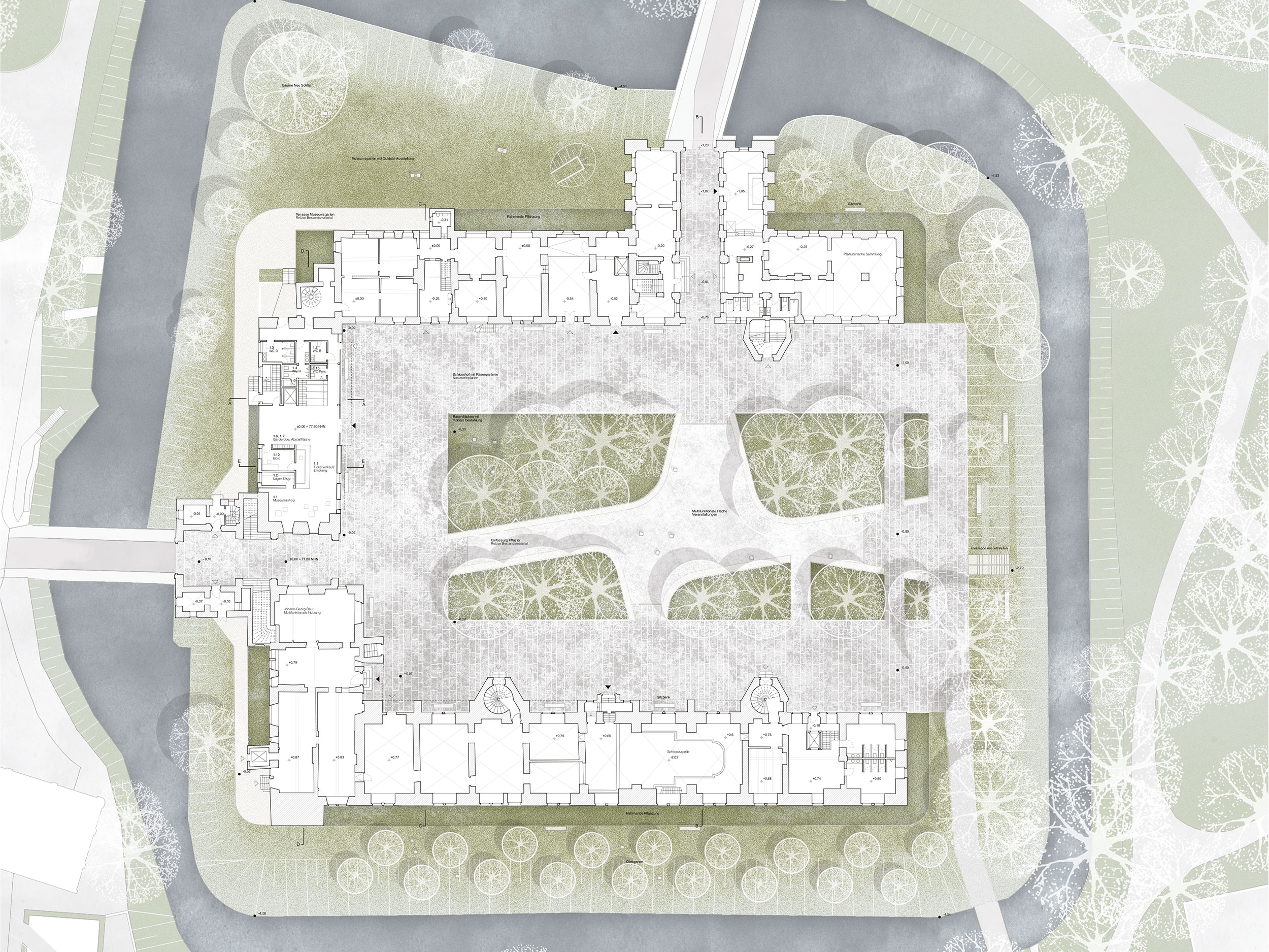 Die städtebauliche Leitidee ist es, die Besonderheit der Gesamtanlage zu stärken und diese rücksichtsvoll und dennoch wahrnehmbar zu ergänzen und abzuschließen. Ein Turm als Ende der Flughafenrandbebauung an der südwestlichen Grundstücksgrenze stellt hierbei den markantesten Baustein dar. Er gibt der linearen und repetitiven Abwicklung der bestehenden Randbebauung einen räumlichen Abschluss und erzeugt durch den Kontrast zwischen Horizontale und Vertikale eine volumetrische Spannung, die die Besonderheit der bestehenden Bandstruktur hervorhebt. Im gleichen Zuge erzeugt die städtebauliche Setzung eine eindeutige und eigenständige Adresse mit hohem Wiedererkennungs- und Repräsentationswert: sie stellt durch die Großmaßstäblichkeit eine Verbindung zu den großen Hangarvolumen her. Entlang der nördlichen Grundstücksgrenze ist eine modulare und lineare Randbebauung in Anlehnung an die denkmalgeschützten Annexbauten vorgesehen. Diese dienen ebenso wie die Annexbauten als dienende Einheiten für Hauptflächen – in diesem Fall den großen Übungs- und Multifunktionsbereichen – und schirmen die Fläche nach außen ab.