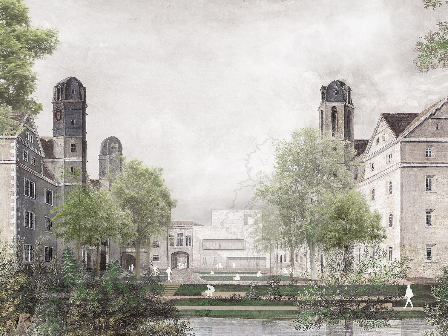 Eine öffentlich begehbare Freifläche an der nordöstlichen Grundstücksecke ermöglicht von der Parallelstraße West aus Einblicke in den Ausbildungsalltag und trägt so der positiven Außenwirkung der Akademie zu. Verstärkt wird dieser Ansatz durch einen öffentlichen Aussichtsturm, der Assoziationen zum Flughafen (-Tower) weckt und als Gelenk in der städtebaulichen Setzung fungiert: die sich südlich anschließende neue Fahrzeughalle der Feuerwache ist um 90° gedreht und von der Straßenkante zurückversetzt. Der Bestandsbau L wird so in der räumlichen Wahrnehmung respektvoll freigespielt und bleibt als besonderes Gelenkgebäude dauerhaft erlebbar.