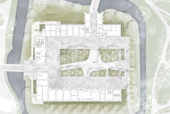 Der neue Baukörper des Besucherzentrums leitet sich aus Form, Gliederung und Volumina des alten Amtshauses ab. Die ehemalige Komposition wird in den neuen Entwurf tektonisch jedoch umgekehrt aufgenommen. Das heißt wo die alten Ecktürme sich befanden, werden sie im Entwurf des Neubaus als Ausschnitte definiert und die ehemalige Baumasse, von der Traufe bis zum Dachfirst, wird als neues Volumen definiert. Diese Beibehaltung aber Umkehrung der historischen Form fügt sich durch ihre eingeschriebene DNA selbstverständlich in die vorhandene Baulücke ein.
